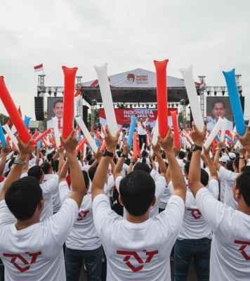 Warna cerah balon membuat tribun lebih hidup dan energik. Selain itu juga, ribuan tepukan menambah semangat penonton, menciptakan visual menarik, dan membuat suasana acara lebih meriah serta berkesan.