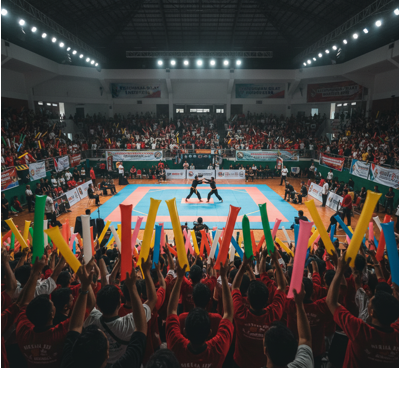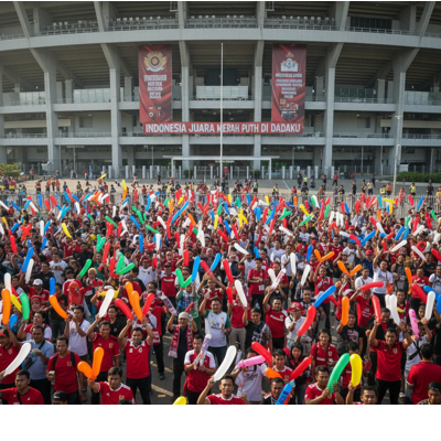 Penggemar memakai balon tepuk suporter untuk mendukung tim favorit, menghasilkan suara nyaring yang memeriahkan suasana stadion.