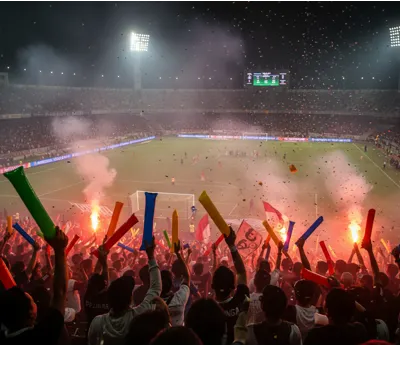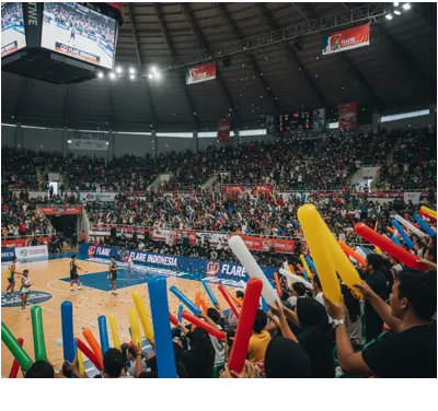 Foto ini menampilkan para suporter yang menggunakan balon tepuk untuk mendukung tim favorit mereka. Selain itu, balon tepuk membantu menciptakan sorakan yang kompak dan suasana stadion yang lebih meriah. Dengan demikian, antusiasme penonton terlihat meningkat dan acara terasa lebih hidup serta berkesan.
