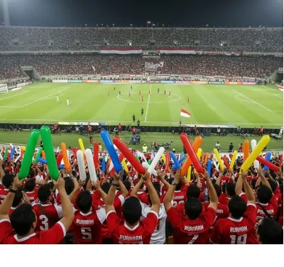 Foto ini menampilkan para suporter yang menggunakan balon tepuk untuk menciptakan suasana meriah. Mereka menepukkan balon secara serempak sehingga energi dan semangat dukungan terasa lebih kuat di lokasi acara.